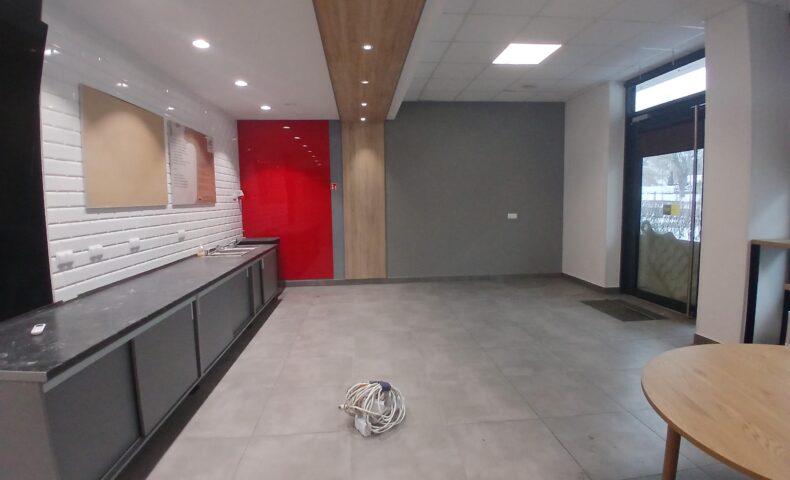 - Lokal w pełni wykończony (sala sprzedaży i zaplecze) – ścianki działowe, drzwi wewnętrzne, podłogi, sufit podwieszany, media rozprowadzone w lokalu (instalacja elektryczna, wodno-kanalizacyjna, klimatyzacyjna, grzewcza) – był wcześniej wynajmowany przez sieciowy sklep, do ewentualnej adaptacji przez nowego najemcę pod własne potrzeby